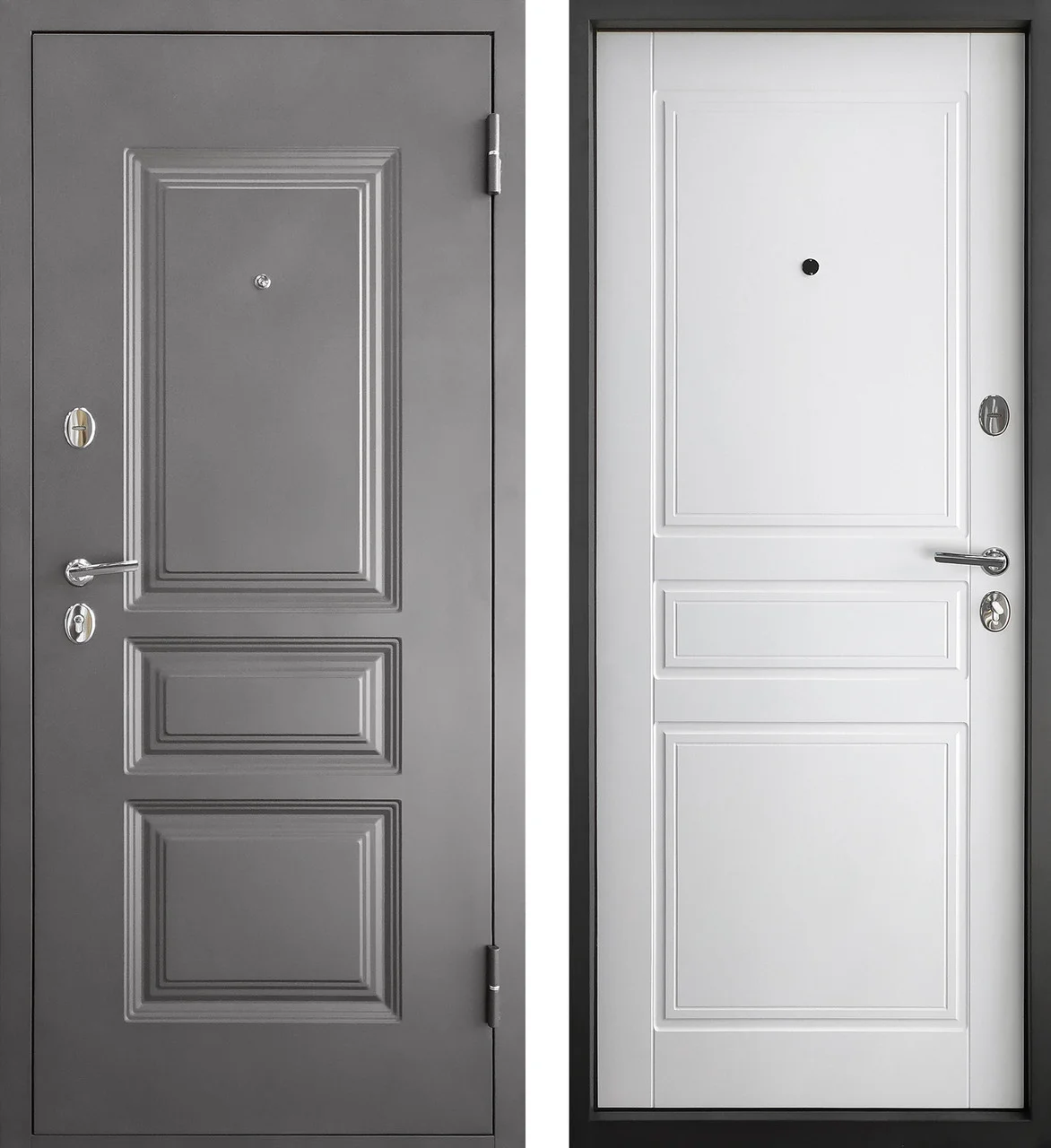 Тип двери Квартирная дверь Размеры по коробке (монтажный габарит) Высота 2050 мм Ширина 860 мм, 960 мм Световой проём (расстояние внутри коробки) Высота 1968 мм Ширина 758 мм, 858 мм Габаритные размеры (вместе с наличниками) Высота 2090 мм Ширина 940 мм, 1040 мм Глубина 94 мм Открывание Правое (наружное), левое (наружное) Наружное покрытие Полимерное покрытие «Мокко» (металл со штампом) Цвет: Серый и мягкий темно-коричневый оттенок Внутреннее покрытие Фрезерованная МДФ панель, 6 мм Цвет: «Ясень Белый» Толщина наружного листа 1,2 мм Толщина полотна 70 мм Внутреннее наполнение полотна Пенополистирол — 35 кг/м3 (высокая плотность) Гарантия 2 года Замки (2 шт.) Верхний — сувальдный «ПРОМЕТ», 3 ригеля 16 мм, РФ (4-й класс взломостойкости) Нижний — цилиндровый (ключ-вертушка) «ПРОМЕТ», 3 ригеля 16 мм, РФ (4-й класс взломостойкости) Защита замков «Замковый карман» — дополнительный лист металла, толщиной 1.2 мм, в замковой зоне Фурнитура Накладки «Овал», сувальдная накладка с автошторкой, ручка 26D Противосъемные штыри на петлевой стороне 2 шт. Количество контуров уплотнения 2 контура уплотнения, тип «DM» (трёхкамерный) Петли 2 шт., на подшипниках, открывание 180 градусов Комплект Дверное полотно, коробка, замки — в сборе Ручки 4 ключа от верхнего замка / 5 ключей от нижнего замка Глазок